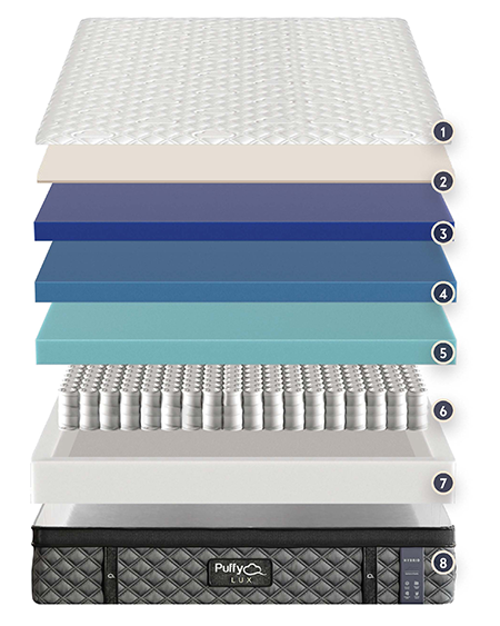 The Puffy Lux Hybrid Mattress is a luxury medium-plush hybrid mattress designed to deliver the perfect combination of softness, support, and cooling comfort. With 8 advanced layers and a 12” profile, it combines temperature-regulating memory foam with individually-pocketed coils for superior pressure relief and responsive back support.
