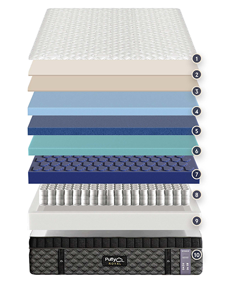 Crafted with a Cool Touch Quilted Cloud Cover (1), Blended Wool Filling (2), and Climate Fiber Layer (3) the Royal Hybrid keeps you cool and dry throughout the night with advanced moisture-wicking and temperature-regulating technology. Layers of Infused Cooling Foam (4), Reflexive Memory Foam (5), and Cloud Comfort Pressure Relief Foam (6) gently cradle the body, relieve pressure points, and adapt to every sleep position.